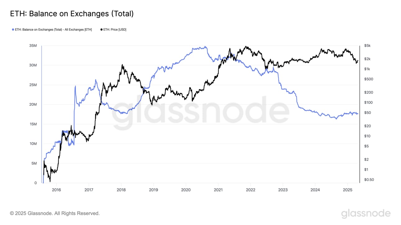 According to Glassnode, just 17.57 million ETH sits on exchanges - that’s only 14.55% of the circulating supply.