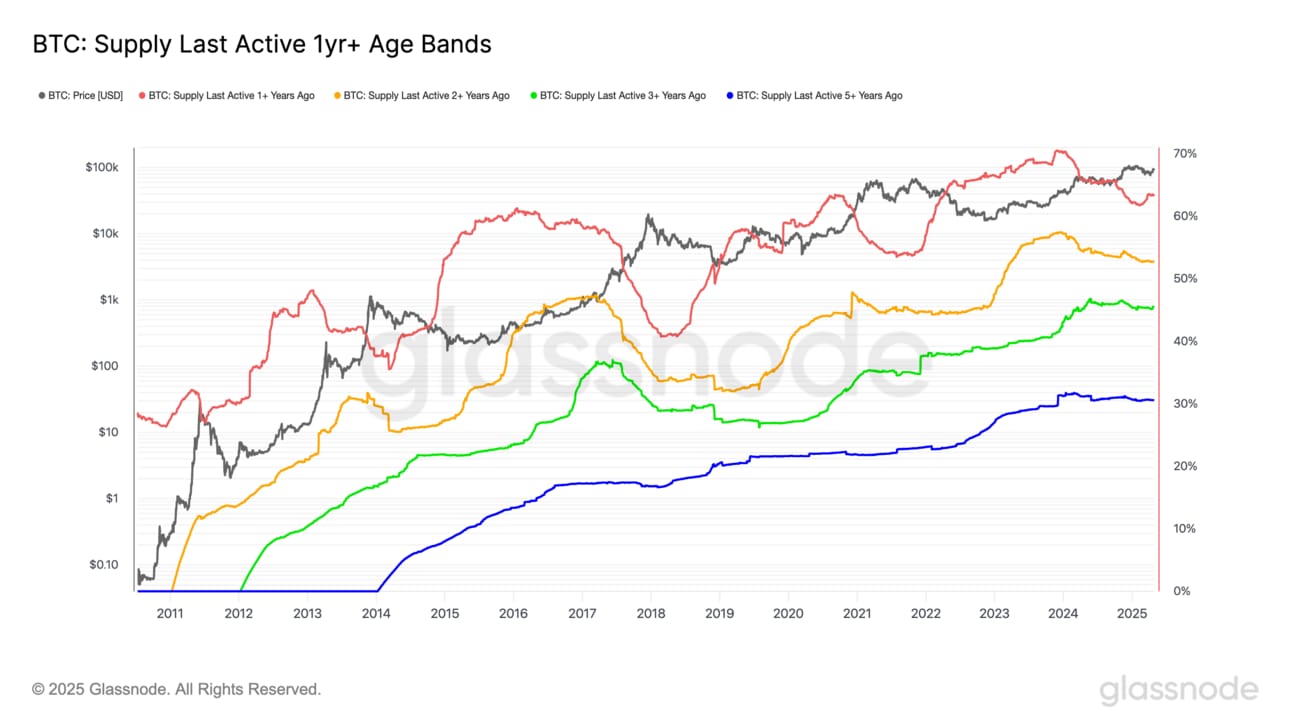 It’s a simple but powerful signal - tracking how much BTC has remained untouched as a percentage of total circulating supply.