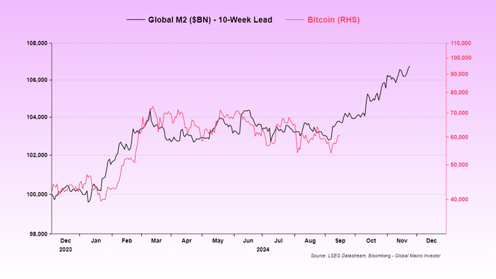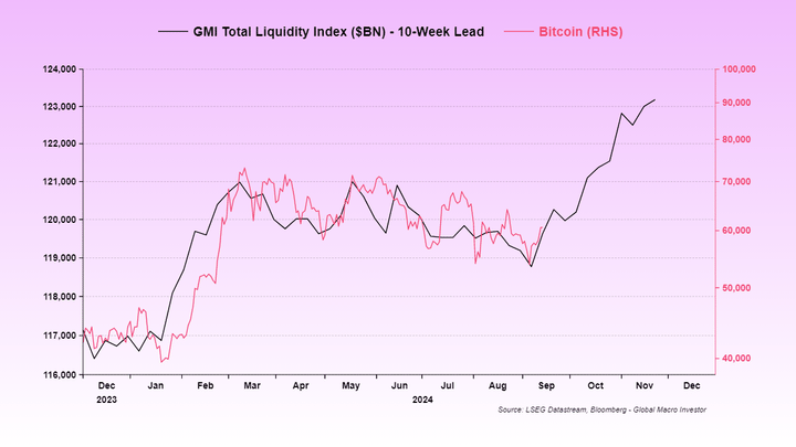 However, crypto prices lag global liquidity by around ~10-12 weeks.
