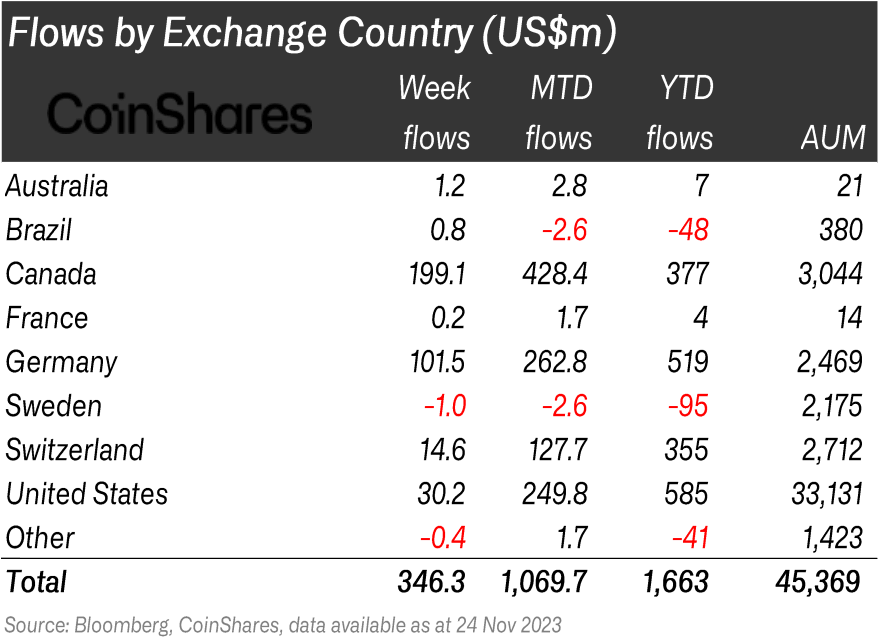 The US saw inflows of $30.2 million. Investors are likely waiting on the approval of the eventual spot Bitcoin ETFs.