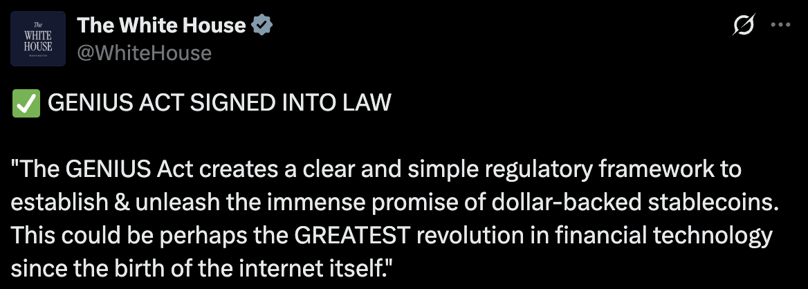 The GENIUS Act, passed by Congress, finally delivered long-awaited clarity on stablecoins - establishing global standards and kickstarting regulatory competition abroad.