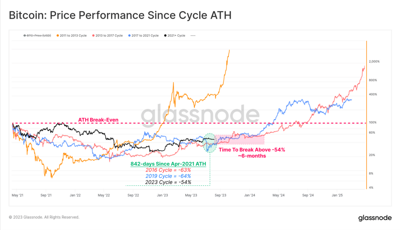 Bitcoin is currently trading -54% below the ATH, compared with -64% of previous cycles.