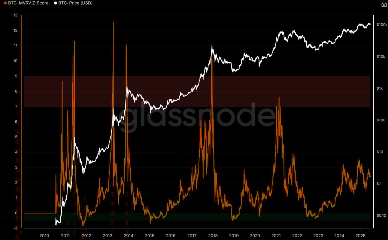 A market top (red zone) is categorised by market value being significantly higher than the realized value. Meaning that the market is overvalued.