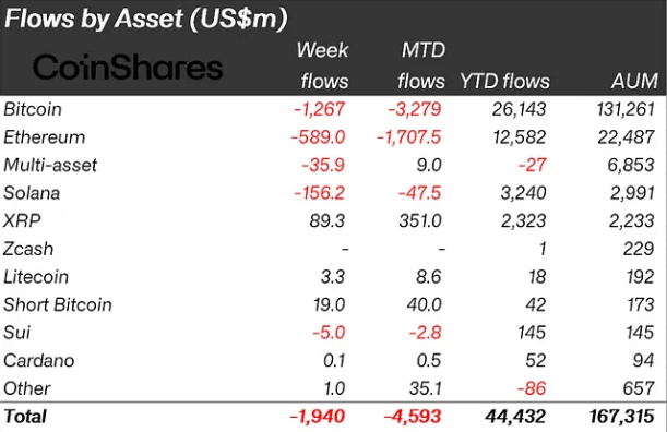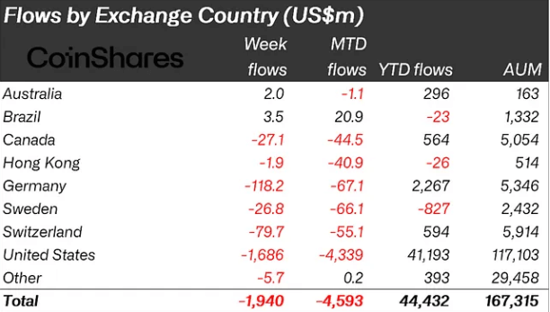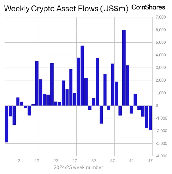 Digital asset funds logged a fourth straight week of outflows last week, with another $1.94 billion heading for the exits.