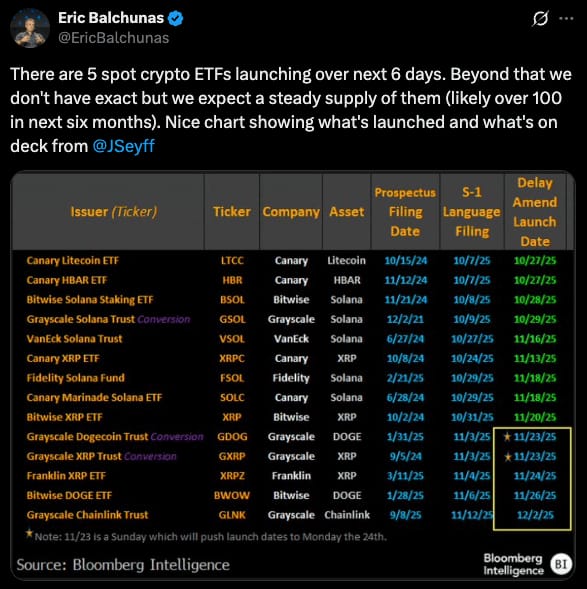 Bloomberg’s ETF analysts now expect 100 plus new crypto ETFs across different assets over the next six months as issuers rush to lock in ticker symbols.