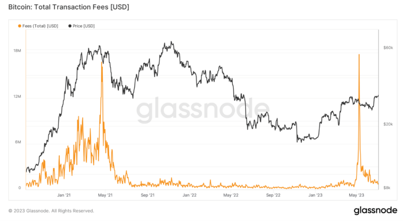 The surge in ordinals led to a significant increase in transaction fees, peaking at over $17.7 million, the highest since the excitement of 2021.