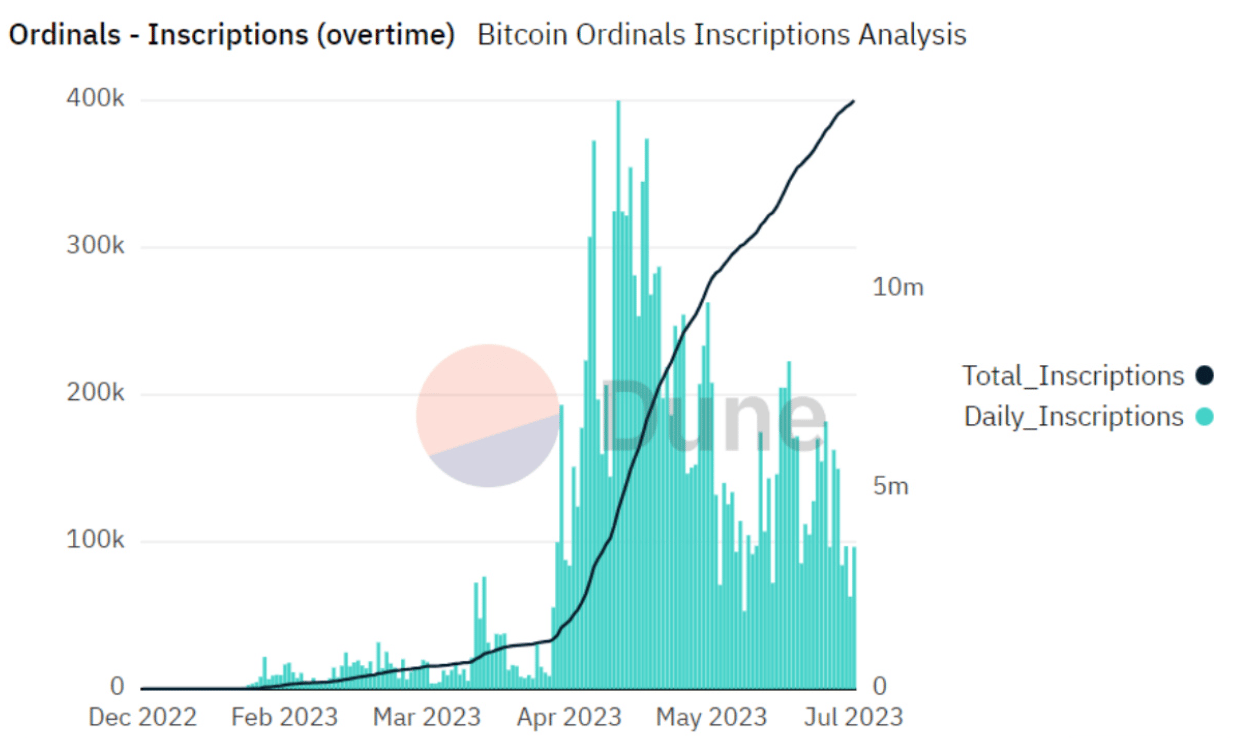 Starting in early April, ordinals inscriptions skyrocketed beyond 10 million, currently standing at 14,756,276. To date, this activity has contributed over $56 million in network fees.