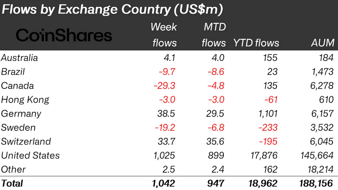 In contrast, Canada, Sweden, and Brazil each saw outflows of $29.3 million, $19.2 million, and $9.7 million respectively.