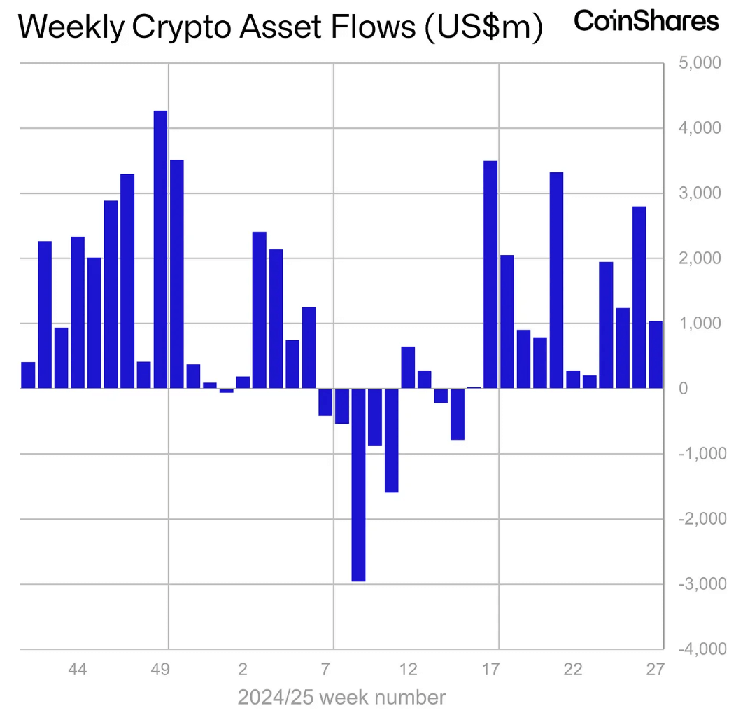 For the twelfth week in a row, digital asset funds saw net inflows of $1.04 billion.