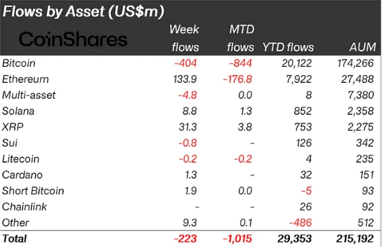 Bitcoin took the biggest hit, with $404 million in outflows — the majority of last week’s losses.