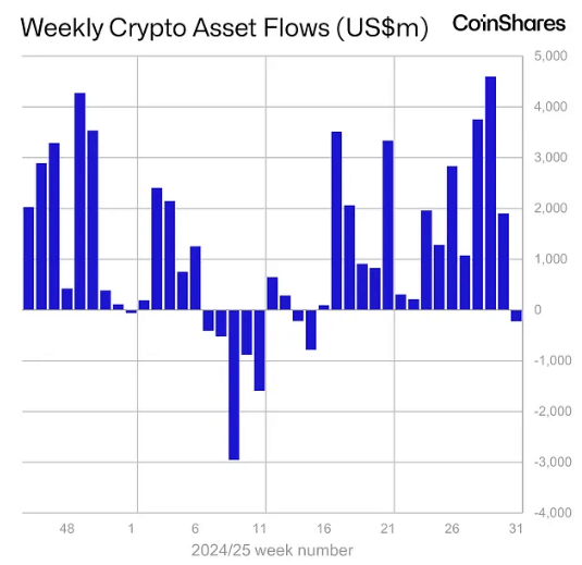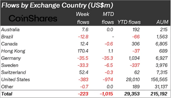 After 15 straight weeks of inflows, digital asset funds finally saw some red - with $223 million in outflows last week.