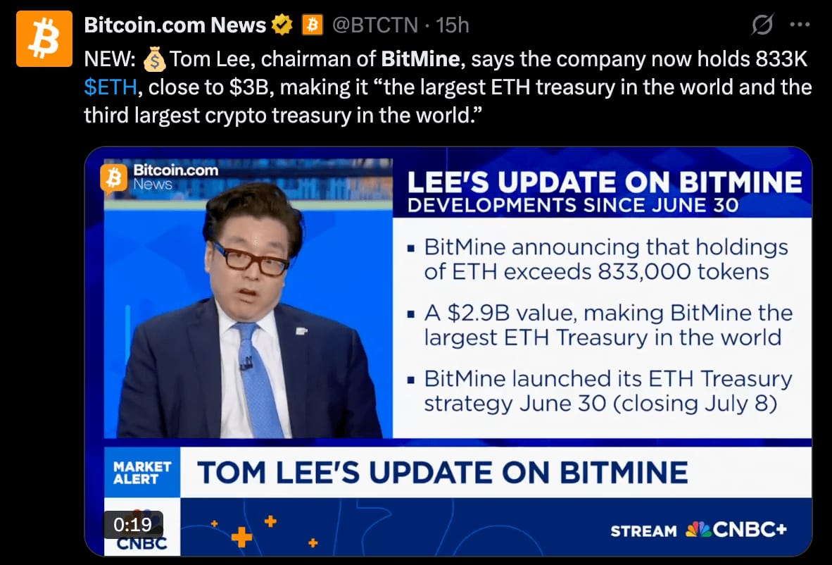 BREAKING: BitMine’s Ethereum holdings surge to 833,000 ETH worth $2.9 billion, largest among public firms