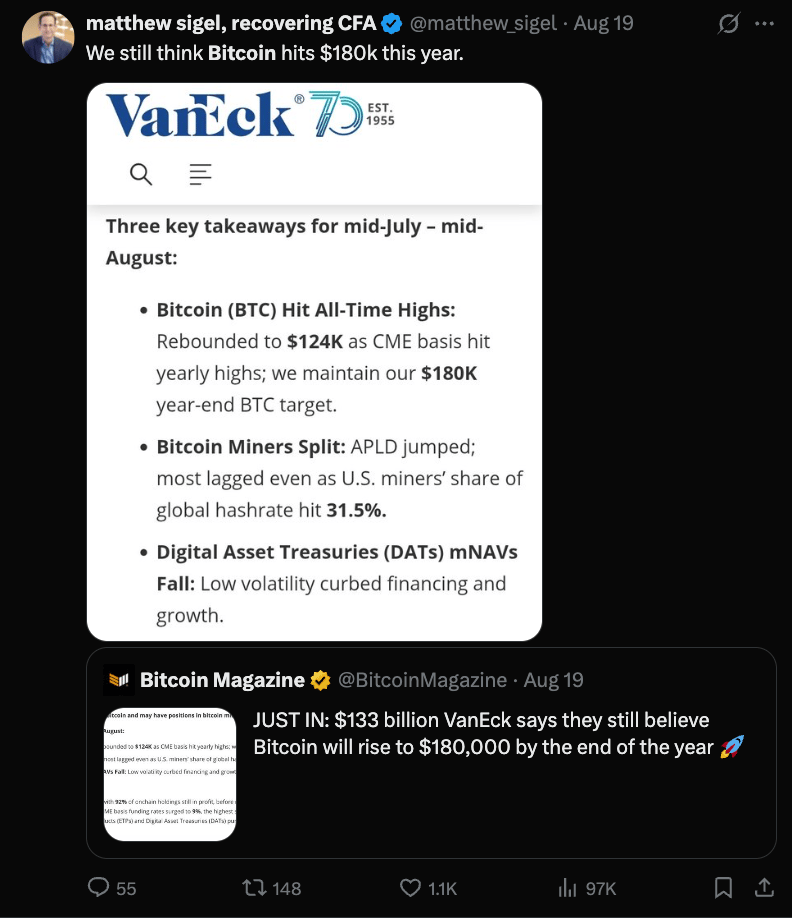 This week, VanEck - one of the largest asset managers on Wall Street and a major Bitcoin ETF issuer - doubled down on their end-of-year Bitcoin price target.