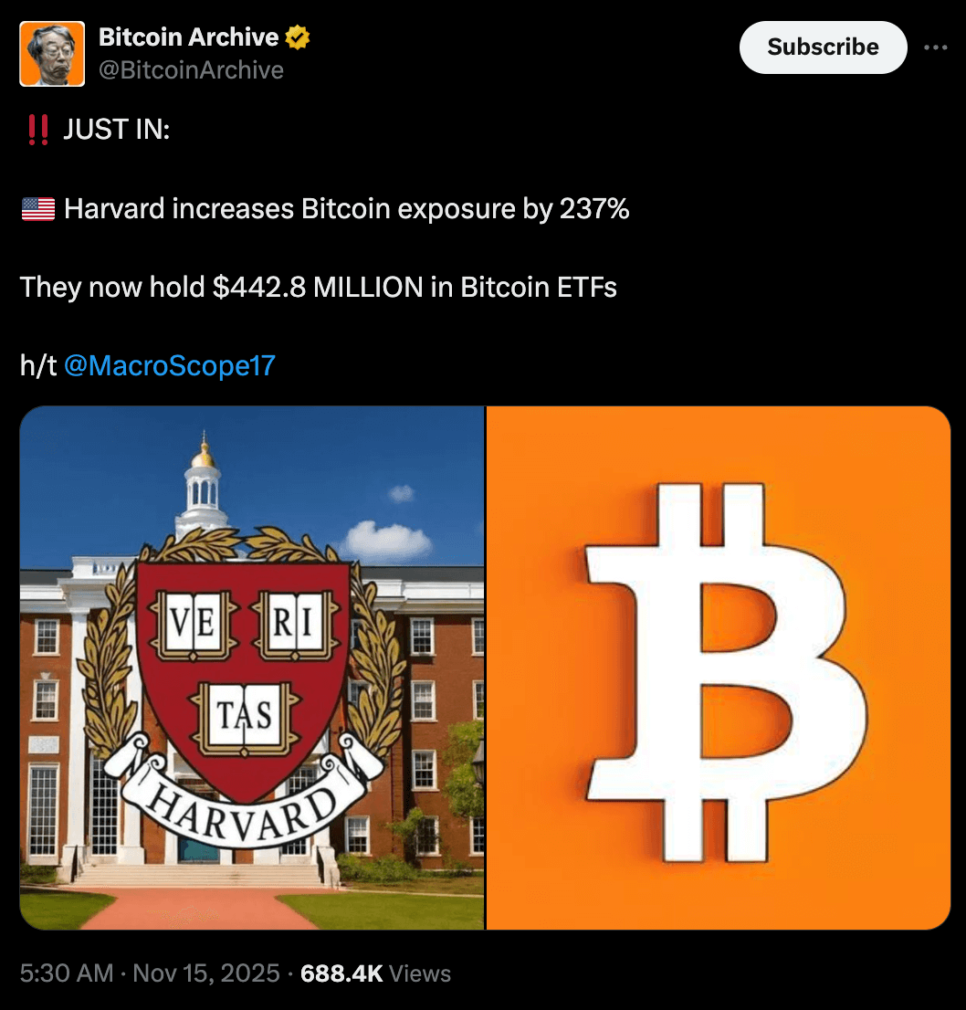 Harvard putting nearly half a billion dollars into Bitcoin ETFs is still only ~1% of their endowment.
