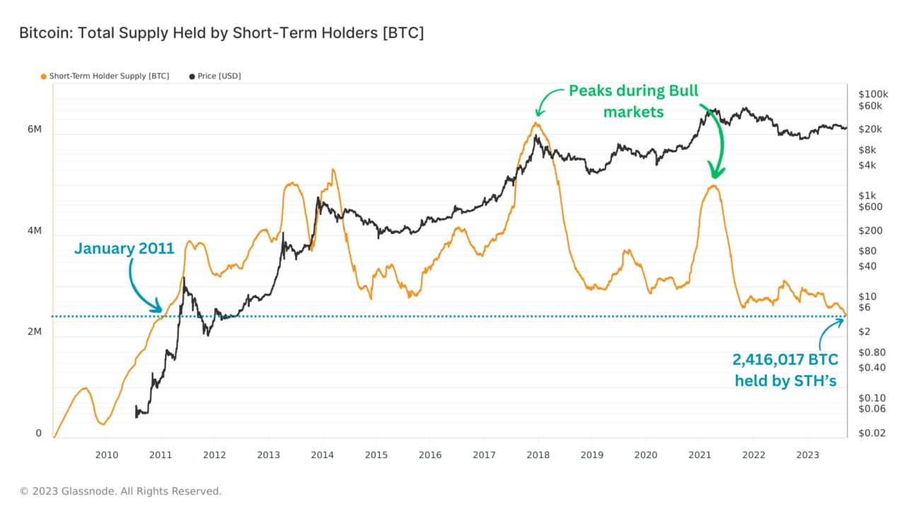 Data from Glassnode reveals that the amount of short-term holders has fallen to the lowest amount since January 2011. 😱