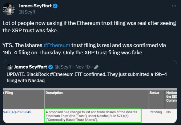 But our trusty ETF expert James Seyffart reassured everyone that the Ethereum ETF filing is 100% real.