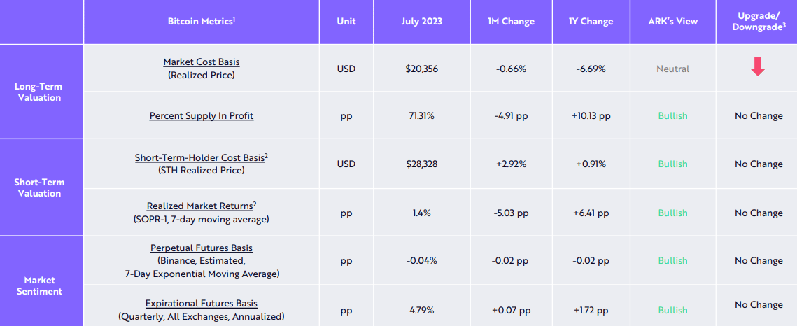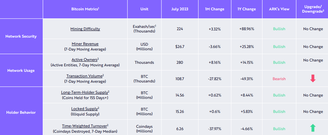 Supporting her arguments is the Bitcoin July 2023 monthly report published by ARK invest, which analyzed various on-chain indicators.