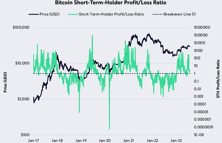So for this measurement to come out to one, suggests that short-term holders on average were breaking even. This makes sense as Bitcoin has traded relatively flat for the last month.