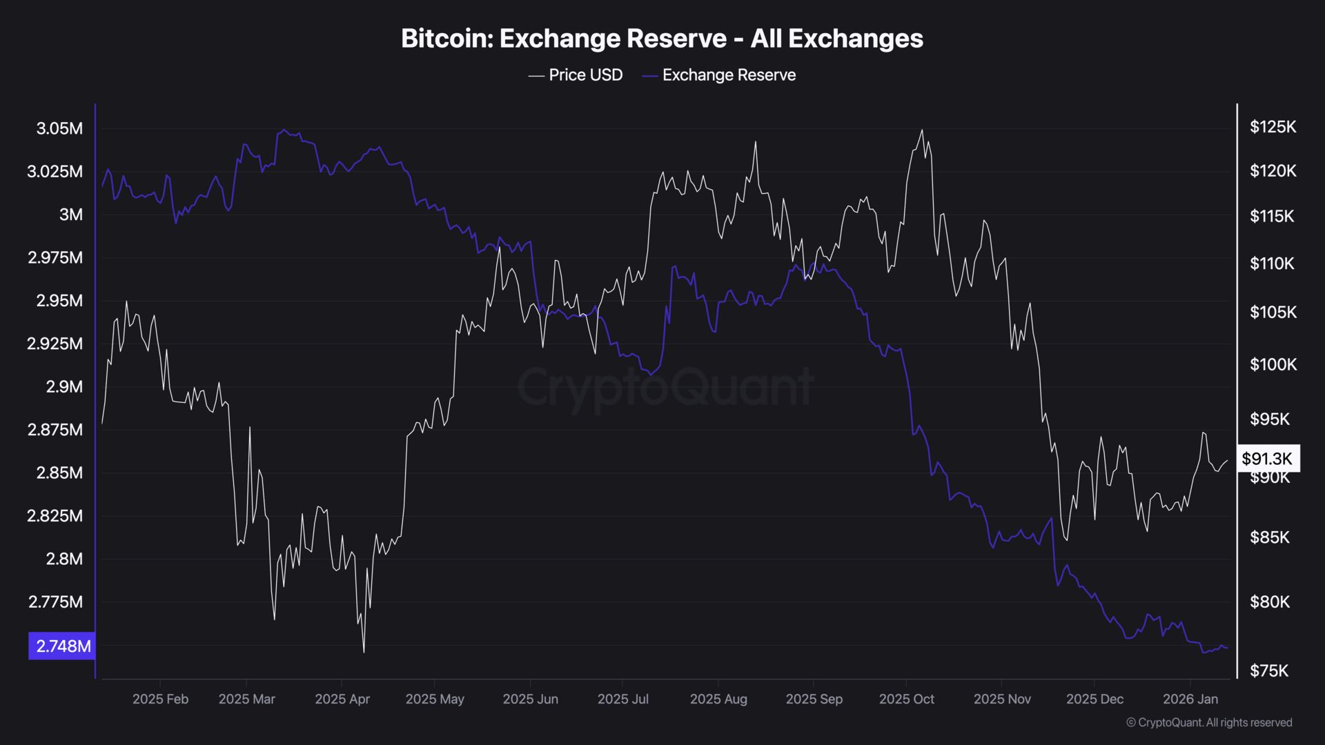 Just 2.75 million BTC now sit on exchanges - 13.76% of the total supply.