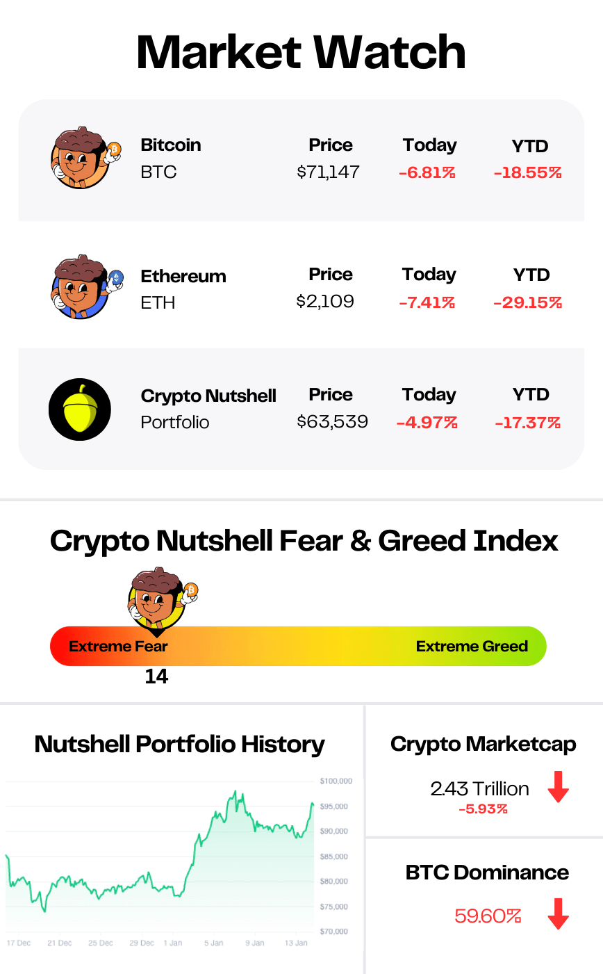 It now trades around ~$71,000, down over 7% in 24 hours and nearly 20% on the week.