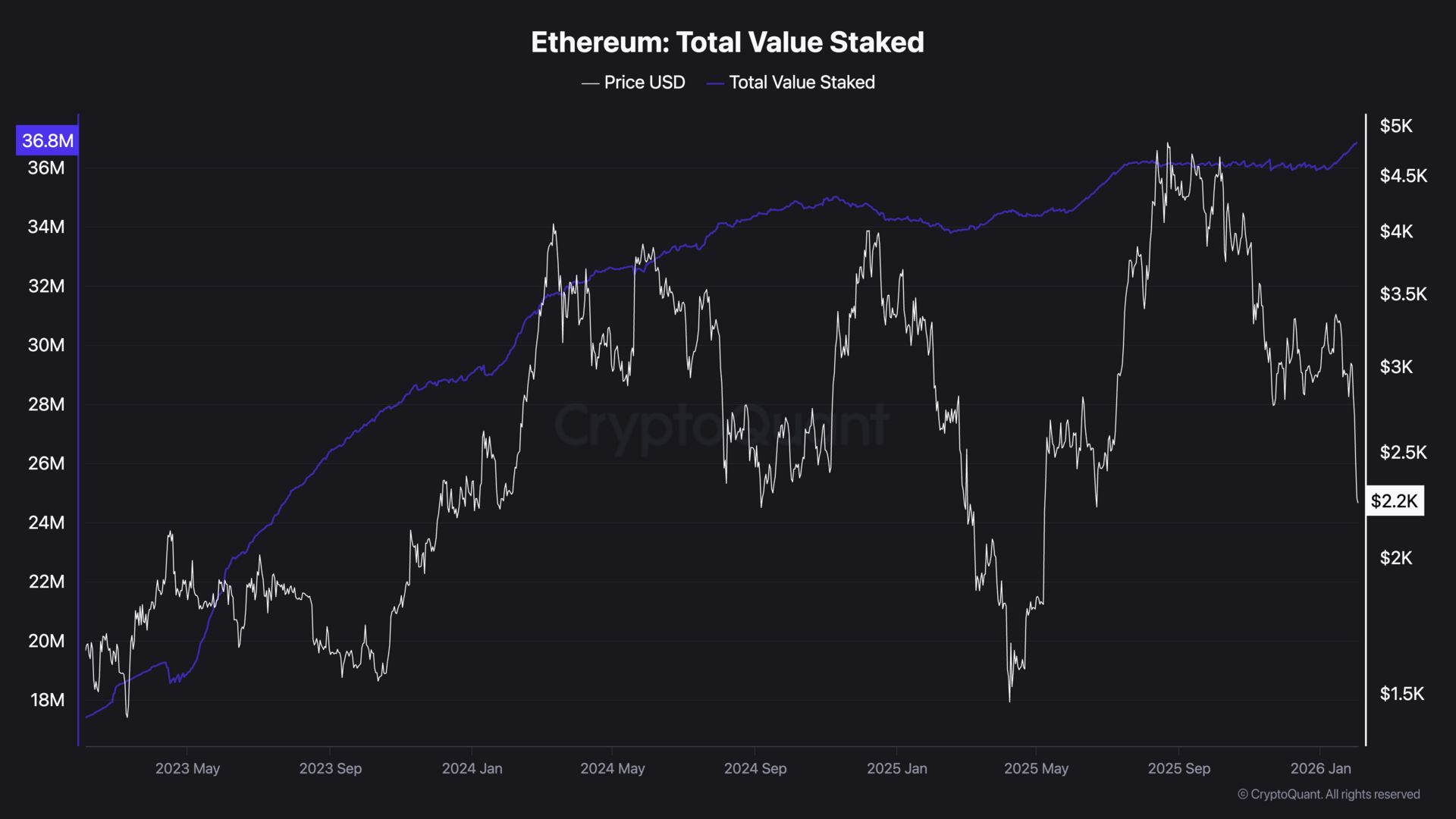 36.85 million ETH is now locked in staking, up 854,337 so far in 2026.