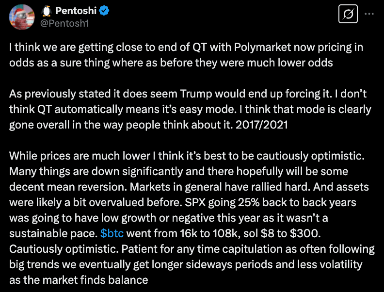 This week, he pointed out that Polymarket is now pricing in 100% odds we see QT end before May: