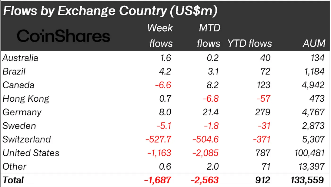 Switzerland followed with a surprising $527.7 million in outflows, which CoinShares attributes to a large seed investor exiting their position.