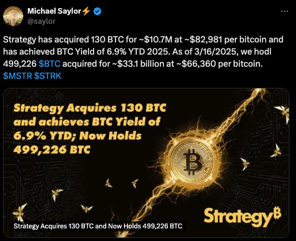 According to an X post from Saylor, the firm added 130 Bitcoin for $10.7 million at an average price of $82,981 per BTC.