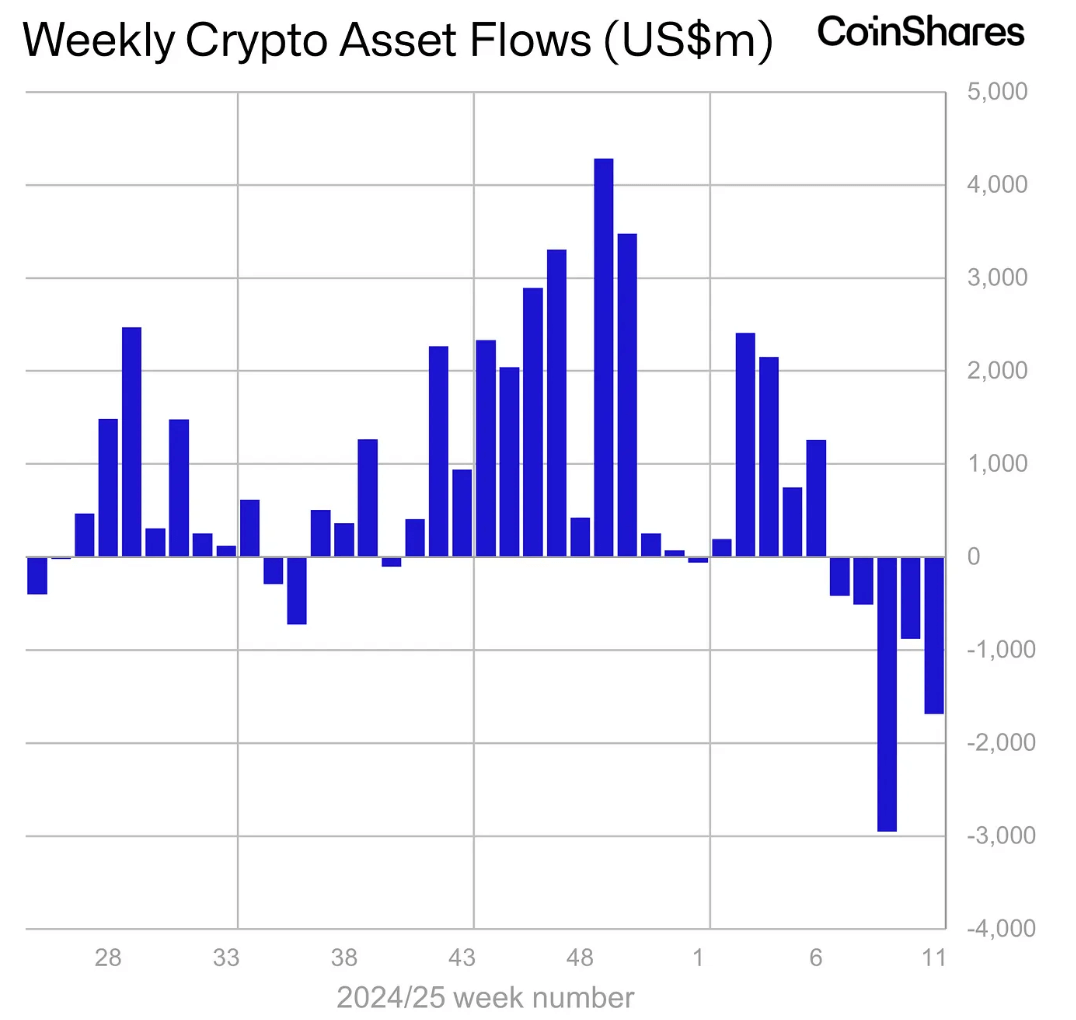 For the fifth straight week, Digital asset funds saw net outflows, with $1.7 billion exiting.