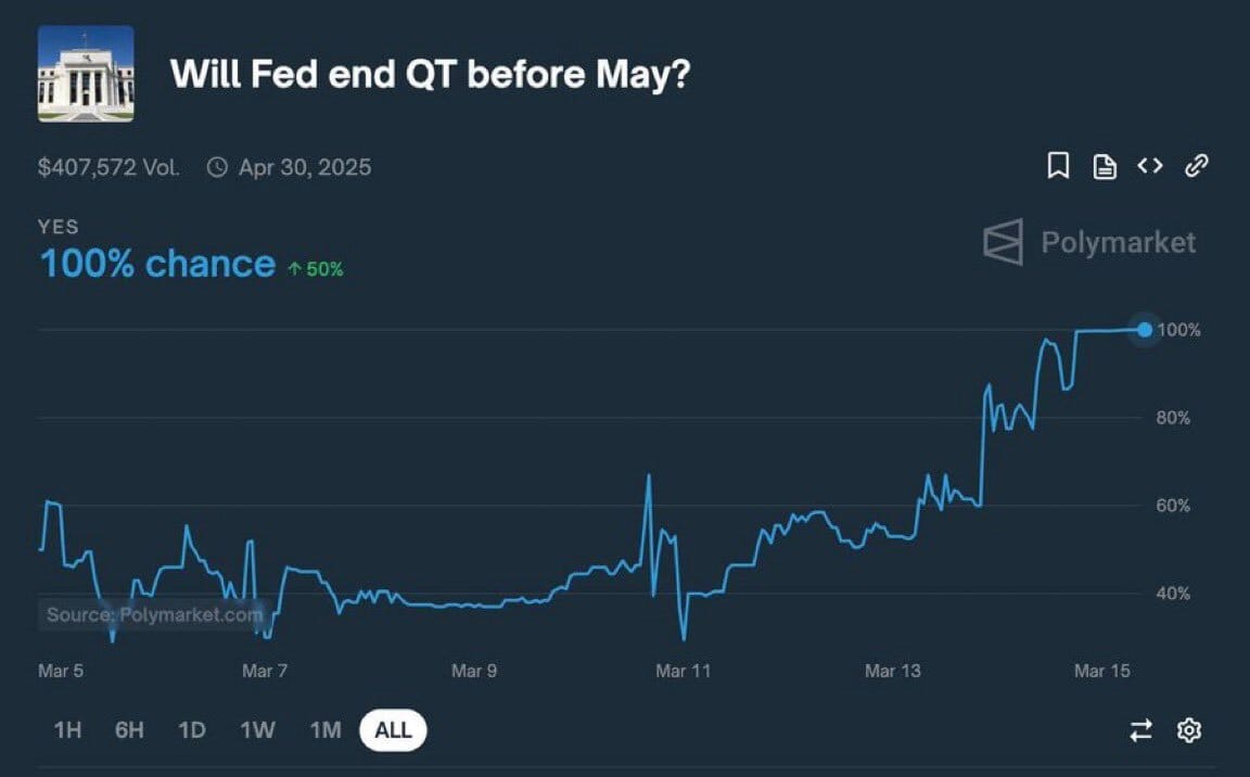Prediction markets are now pricing in 100% odds that Quantitative Tightening (QT) ends before May.