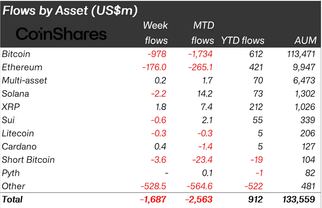 Bitcoin once again saw the majority of outflows, with $978 million exiting.