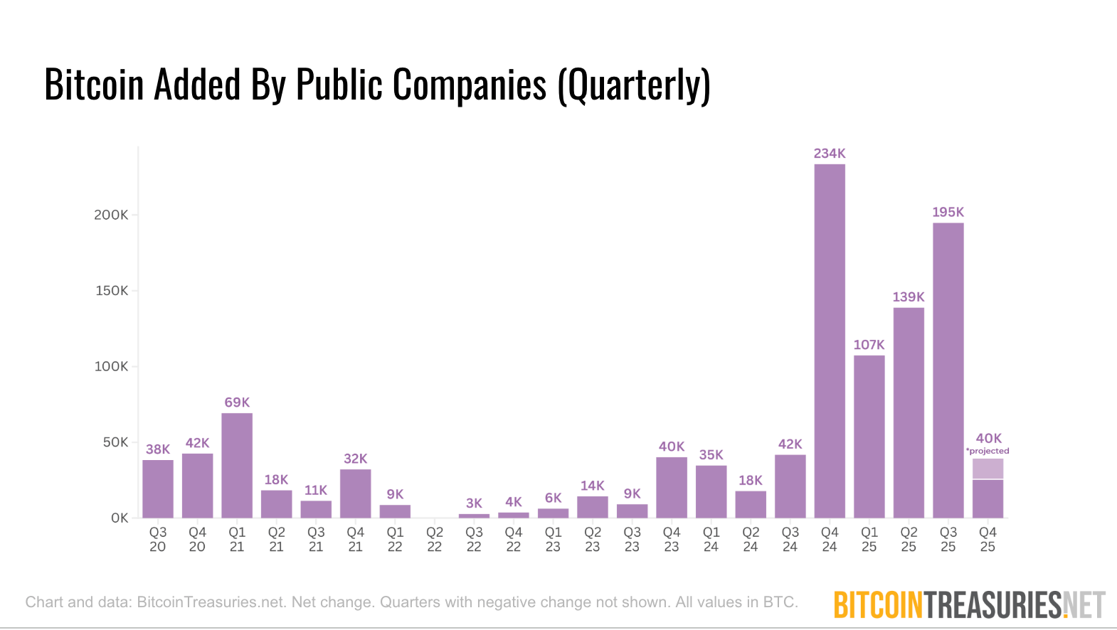 The fourth quarter is on pace to add roughly 40,000 BTC to corporate balance sheets - the weakest quarter since Q3 2024 and well below the "summer buying frenzy" that defined the first half of this year.