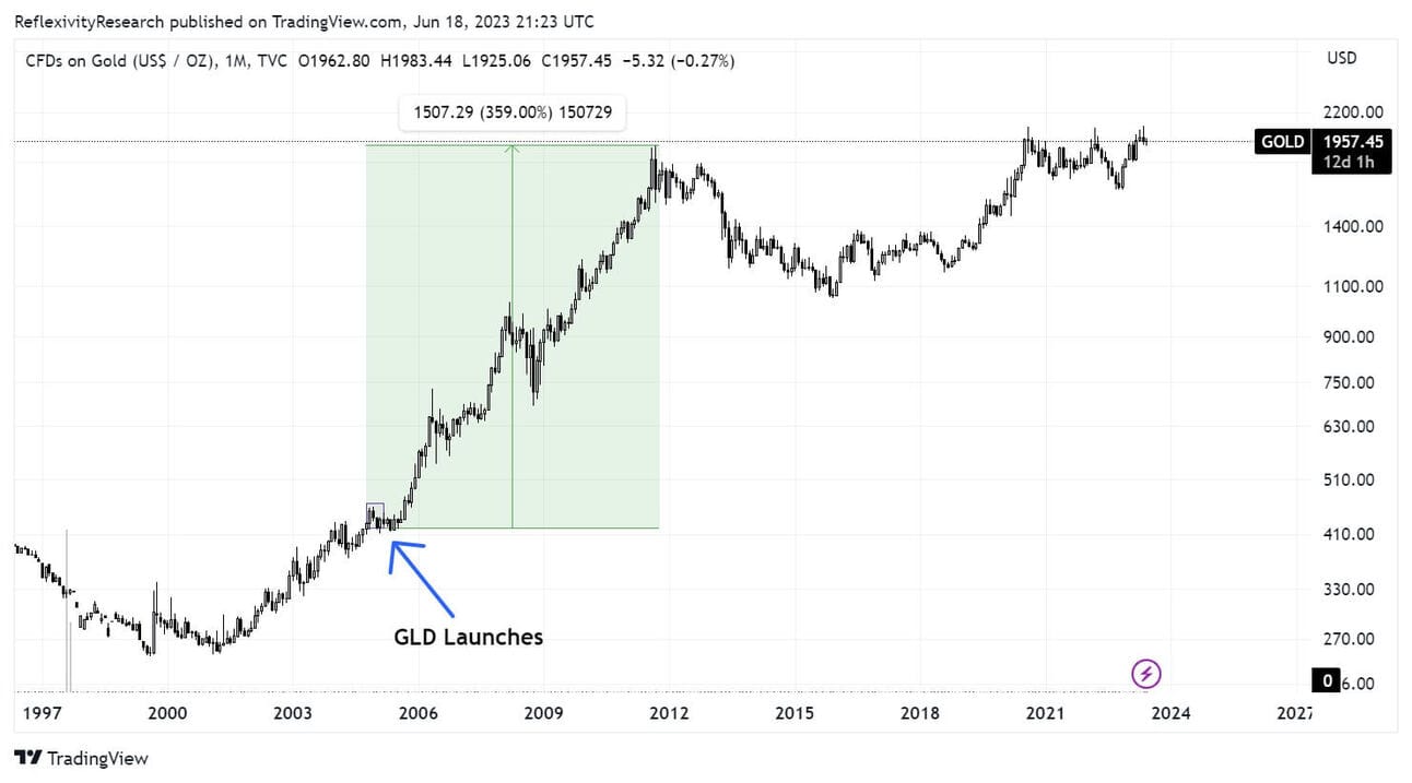 In the 8 years following its launch in 2004, the price of gold went up 359%.