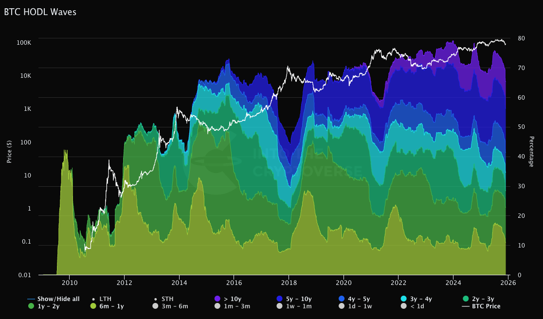 The 6–12 month band took the biggest hit as shorter term holders sold into recent price strength. The 1–2 year and 2–3 year groups also thinned out, which tells you mid-cycle traders are taking risk off the table.