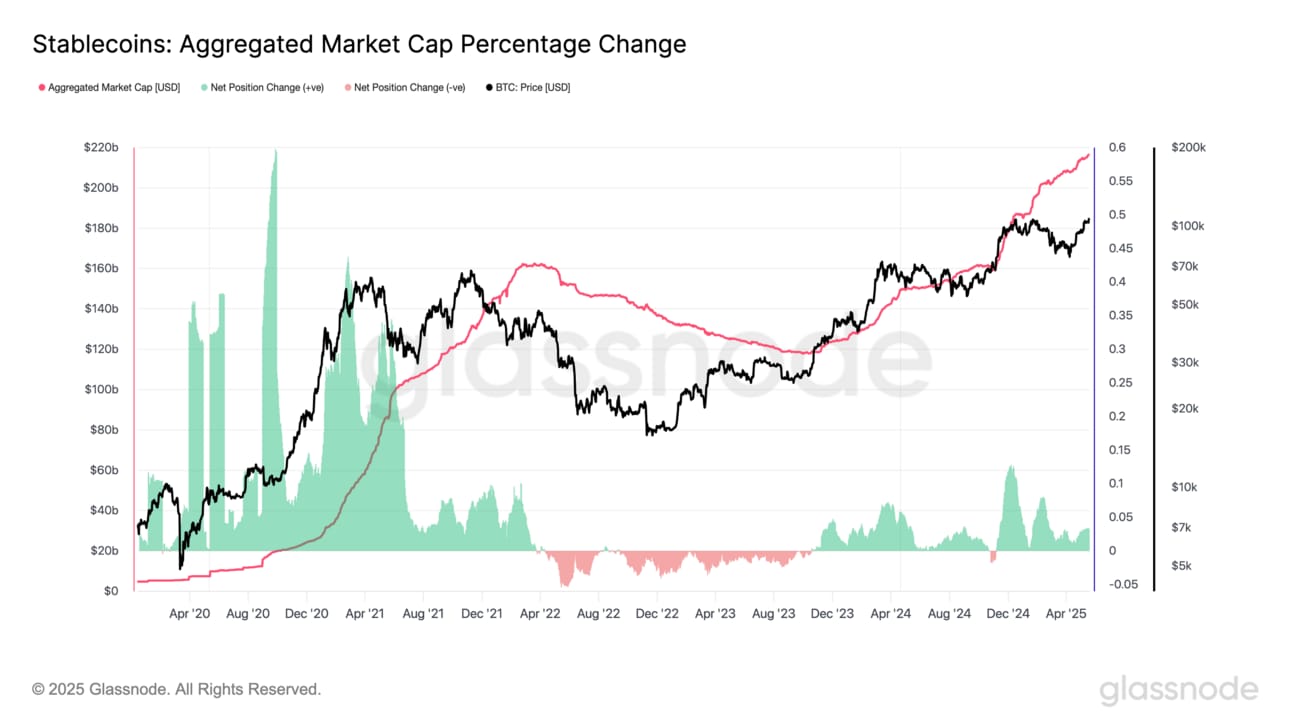 Earlier this week, stablecoin supply hit a fresh all-time high of $216.35B.