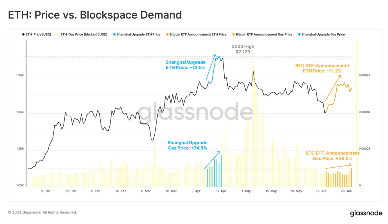 Despite the recent price increase of ETH, network activity has not seen a substantial surge in 2023. Gas prices, which indicates blockspace demand, have remained relatively low, especially after the ETF filing announcements.