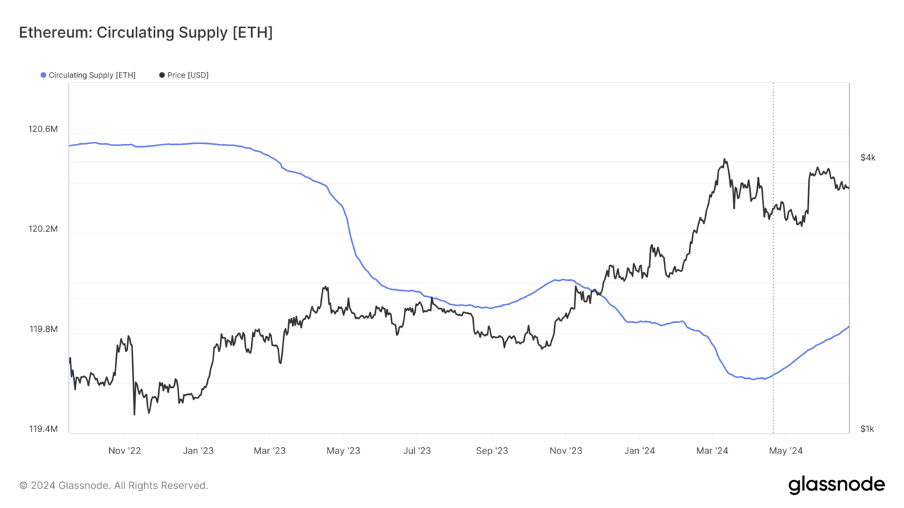 The chart below shows Ethereum’s circulating supply since The Merge.