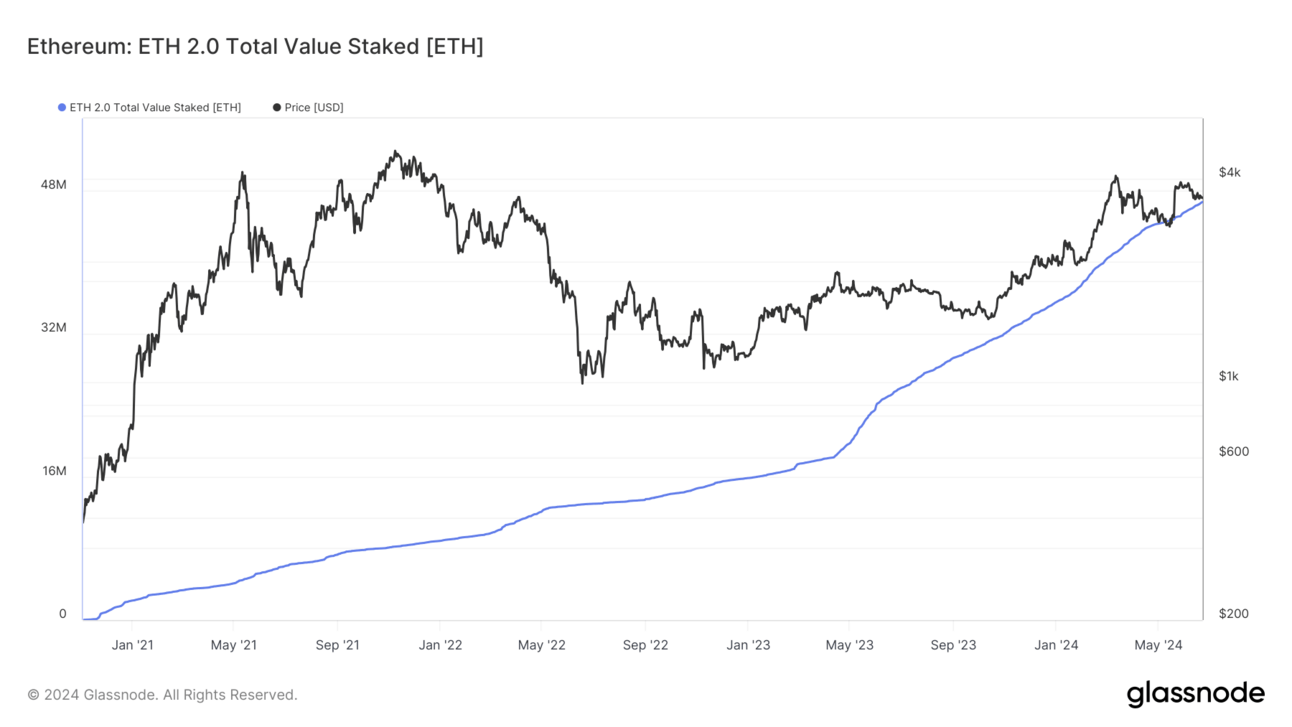 Ethereum Staked: 46,687,005 ETH (~38.96% of the circulating supply)