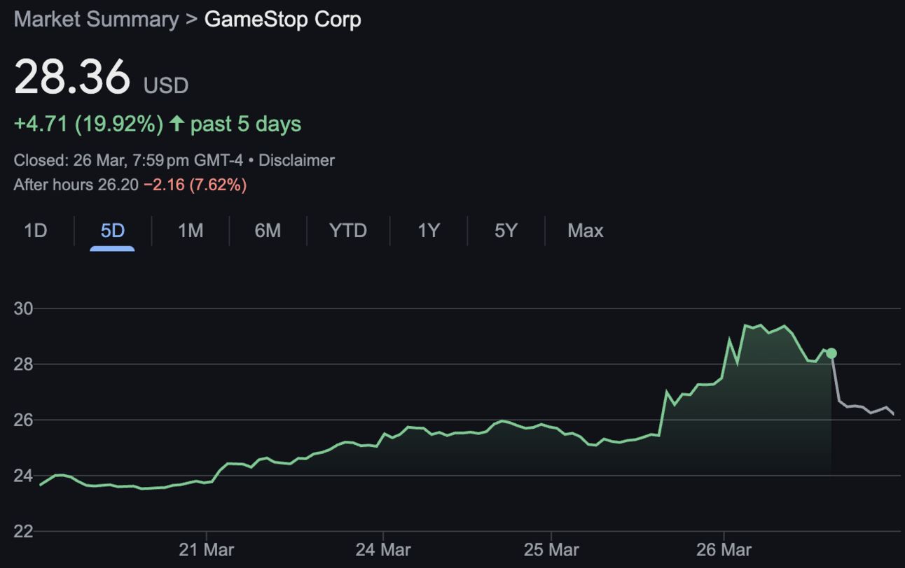 GME stock popped 12% on the news, closing at $28.36 on the day. (That’s +19.92% over the past 5 days.)