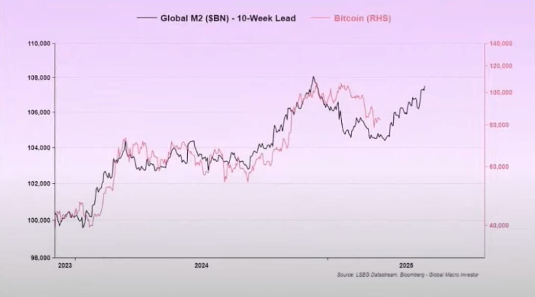 Bitcoin tends to follow Global M2 with a 10-week lag.