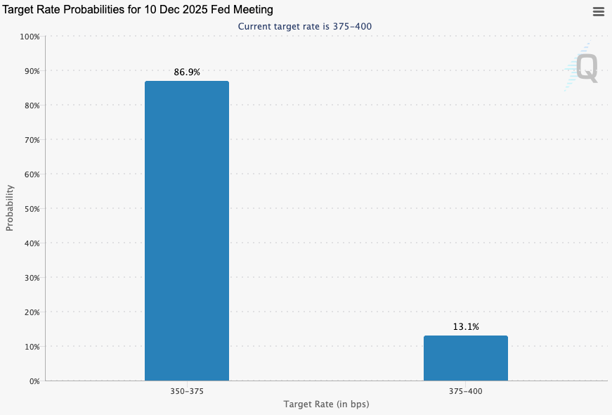 CME FedWatch and prediction markets are putting the odds of a December cut at around 87%.