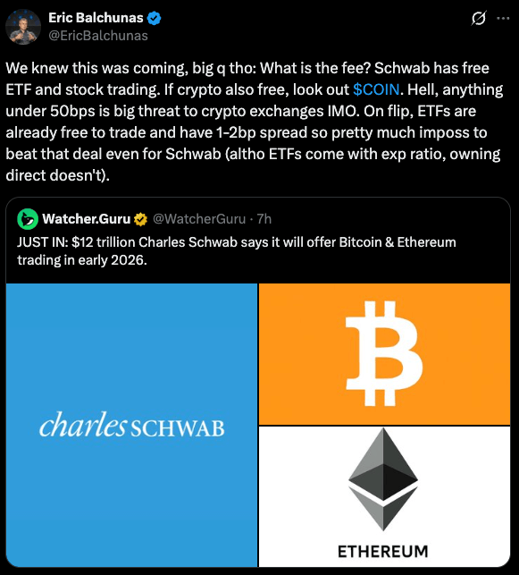 Schwab is famous for zero commission stock and ETF trading. If it applies the same low fee mindset to crypto, that makes life difficult for the classic exchanges.