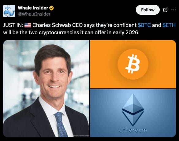 Schwab already has the distribution. The moment it flicks the switch, a massive chunk of US households can own spot crypto without ever downloading a crypto exchange app.