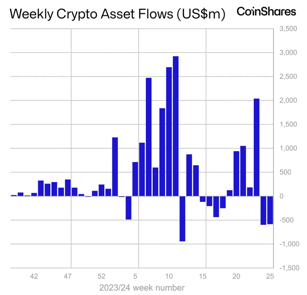 Solana, Litecoin and XRP bucked the trend experiencing inflows of $2.7m, $1.3m & $0.7m respectively.