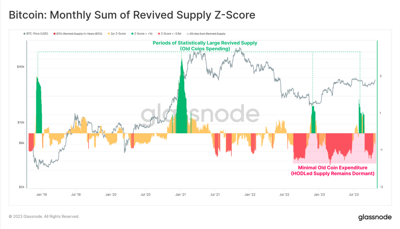 Today we’ll be taking a look at the Bitcoin Monthly Sum of Revived Supply Z-score.