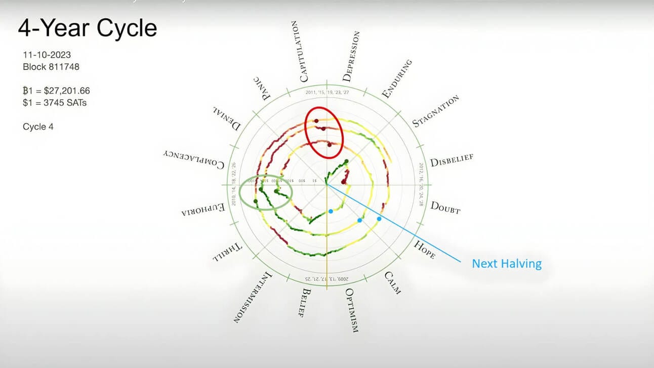 Bitcoin’s peak & trough happens roughly at the exact same point in each 4 year cycle.