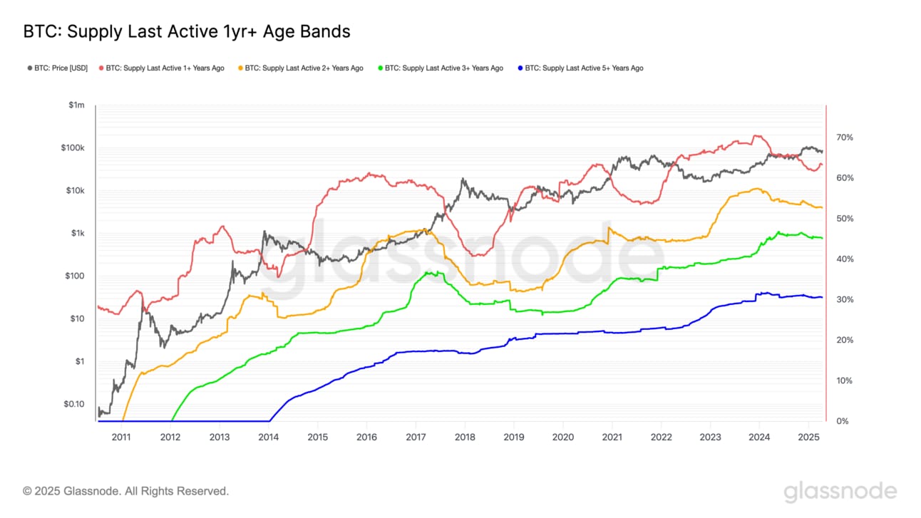 It’s a simple but powerful signal - tracking how much BTC has remained untouched as a percentage of total circulating supply.