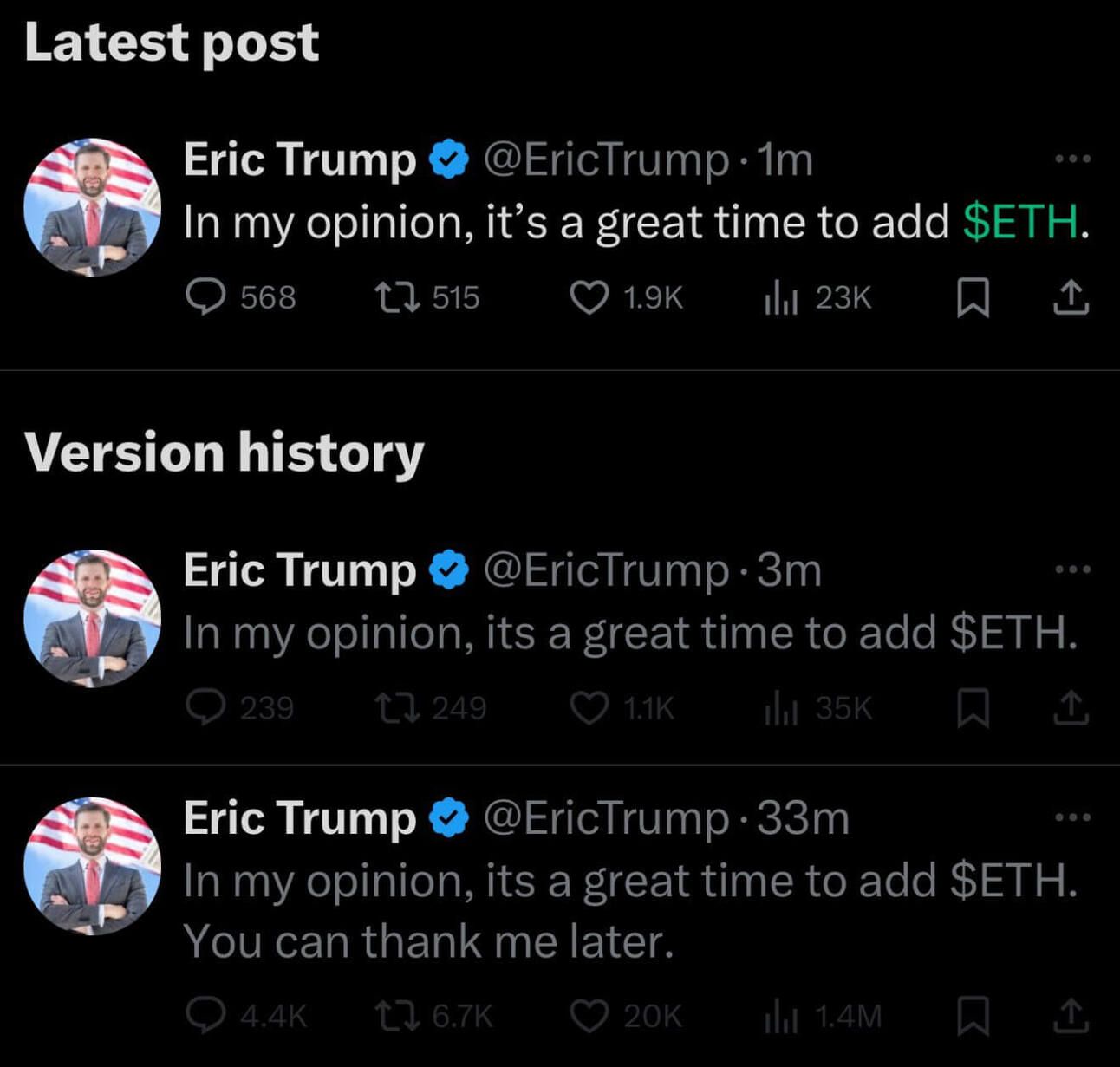 However, Eric edited this tweet, twice. Here’s the original versions: