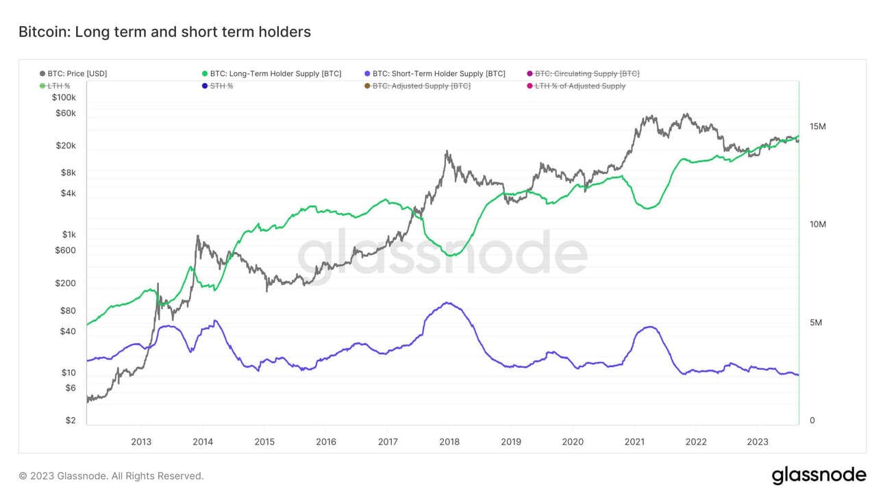 The chart below shows us the amount of Bitcoin held by long and short term holders. Short-term holders become long-term holders when they’ve held their coins for longer than 155 days.