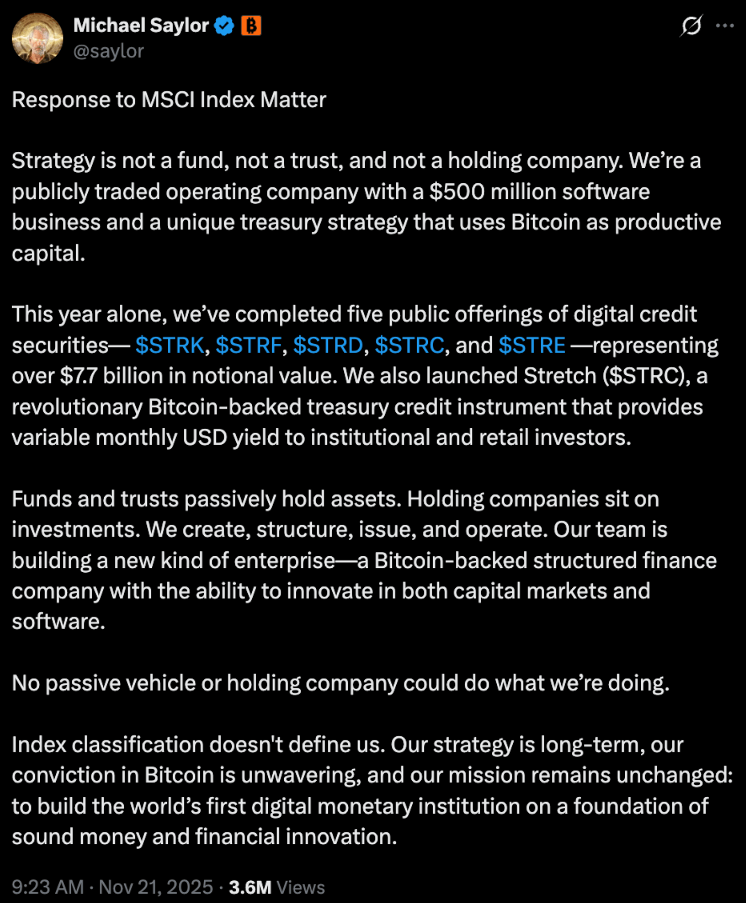 He also says index classification does not define the business, and that their “conviction in Bitcoin is unwavering.”